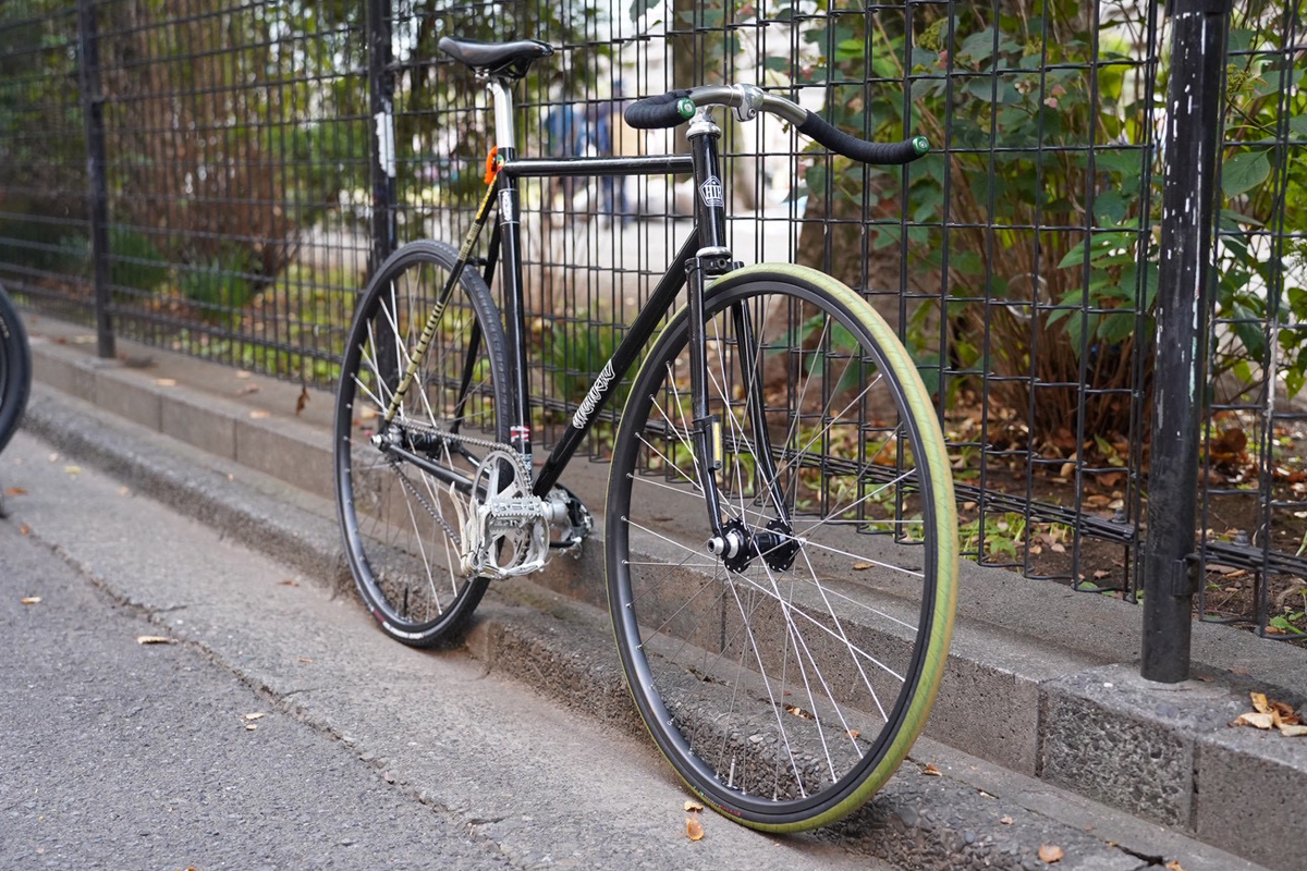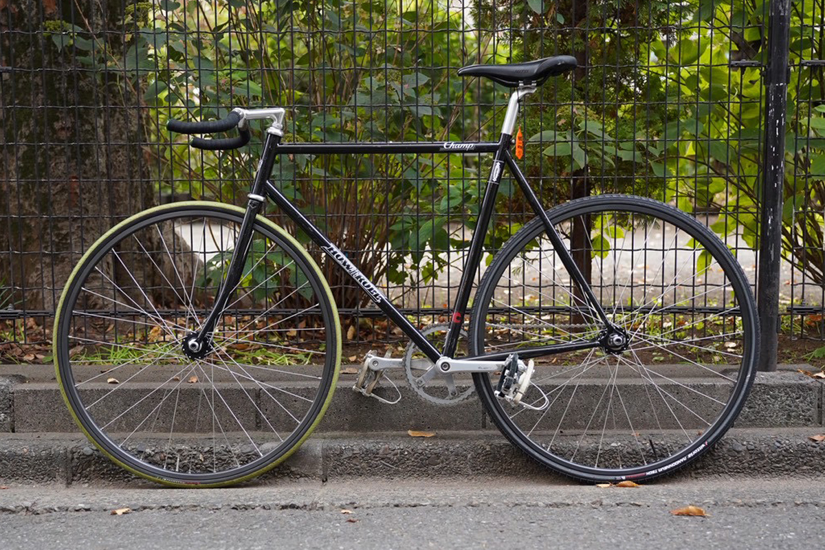 W-BASEとも親交の厚いスケートショップFTCのスタッフでスケーターのR氏のHOW I ROLLのCHAMPです。ストックの状態で手に入れ徐々に各部をカスタム。フレーム、フォーク以外はほとんどに手が入ってます。そして手を入れることでNJSフレームを一から組み上げたような美しさを醸し出しています。このルックスが可能なのは競輪をリスペクトしてデザインされているCHAMPならではのもの。実際に足回りもかなり拘って変更されており、ダブルバテッドのクロモリフレームを生かして走ることが気持ちいいバイクに仕上げってます。