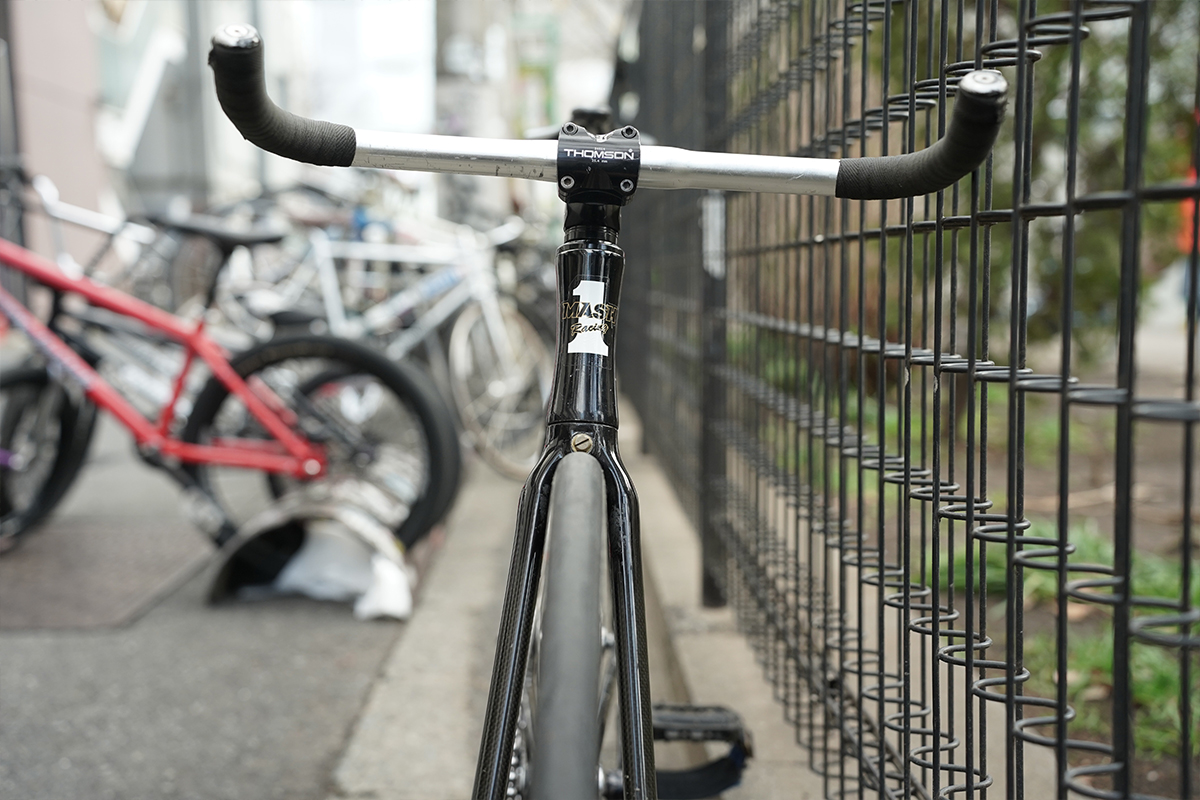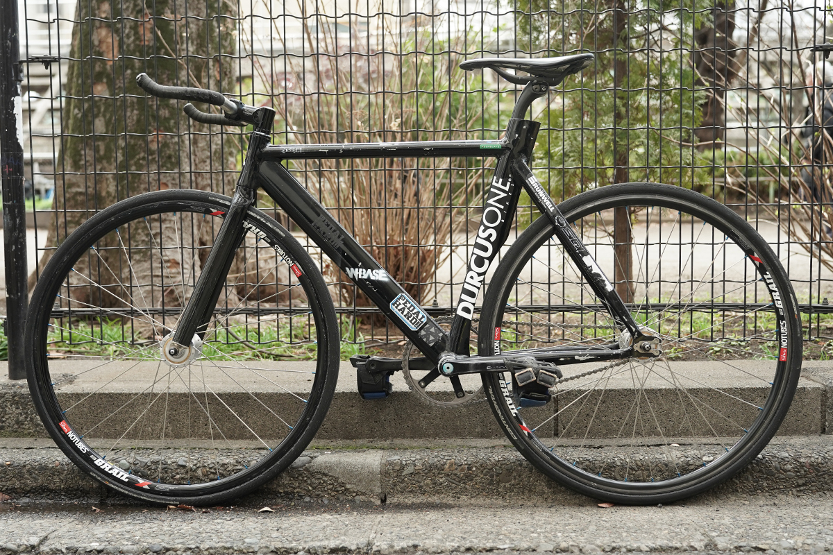 フレームは、10年以上前に発売されたDURCUS ONEのGUMBALL(サンプルモデルの可能性あり)。クリテリウムやメッセンジャーレースでは、基本的にこのフレームを使用しているそうです。